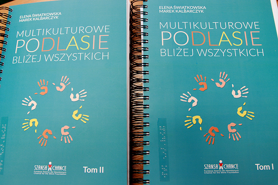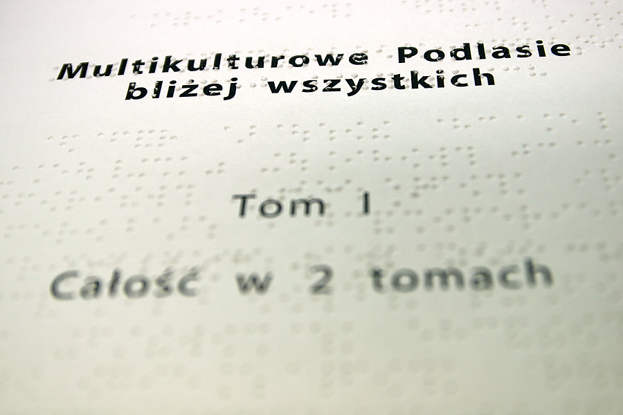 Publikacja „Multikulturowe Podlasie bliżej wszystkich” została wydana w sposób inny niż zwykle, a mianowicie drukiem powiększonym i naniesionym nań pismem Braille’a, czyli w tak zwanej technologii transparentnej. Popularyzacja nowoczesnej rehabilitacji przy okazji mówienia o naszej historii, zabytkach, pomnikach, najszerzej rozumianej kulturze to zadanie nie tylko ciekawe, ale wręcz fascynujące. Przedstawiamy nowoczesne spojrzenie na dobrodziejstwa płynące z aktywności, integracji i zdobywania wszelkich umiejętności, a zarazem zachęcamy do poznania atrakcji kulturowych i turystycznych Podlasia. W tym właśnie połączeniu odnajdujemy wyjątkową przyjemność.